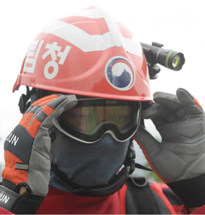 (Definitely protecting your face) This product made goggles and masks into one product and was patented in Korea. Wearing existing goggles and masks or buffs often leads to foreign substances such as embers and dust through the gap between goggles and masks. It was made integrally with a product made by supplementing this point, eliminating the gap. In addition, in the case of goggles, bulletproof polycarbonates were used and lenses were made in an extrusion molding method to eliminate distortion of view. And it can be used for a longer time without fogging through a super hard anti-fog coating. This product can be used by exchanging lenses for each type depending on the situation. The mask is in the form of a buff type, and the elasticity and flame retardant effects are maximized by mixing aramid and Lenzing rayon. When combined with goggles, a face foam was placed on the surface of the face to improve the fit.