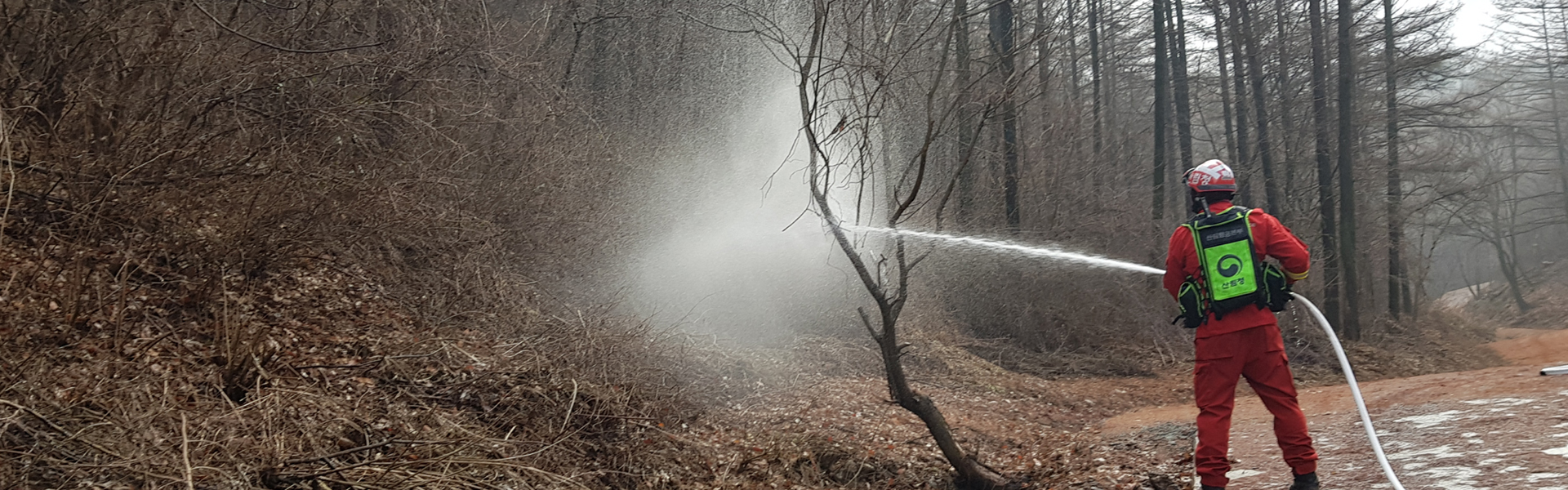 However, since it is difficult to supply water with human power, the Mechanical System was introduced to effectively and quickly extinguish forest fires. The system enables long-distance or high areas water supply through hoses using small, medium-sized pumps or fire trucks, and can implement various forest fire extinguishing tactics depending on the size and type of forest fires. In addition to the engine pump, the system consists of main hoses, spray guns, distributors, portable water tanks, branch hoses, and movable pulleys.